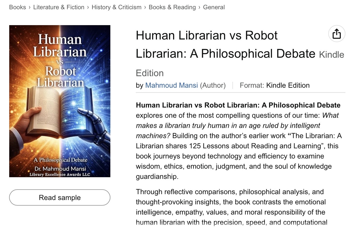 Human Librarian vs Robot Librarian: A Philosophical Debate explores one of the most compelling questions of our time: What makes a librarian truly human in an age ruled by intelligent machines? Building on the author’s earlier work “The Librarian: A Librarian shares 125 Lessons about Reading and Learning”, this book journeys beyond technology and efficiency to examine wisdom, ethics, emotion, judgment, and the soul of knowledge guardianship.